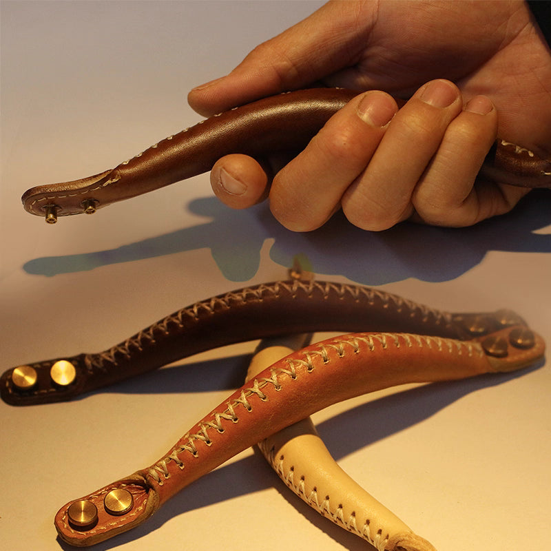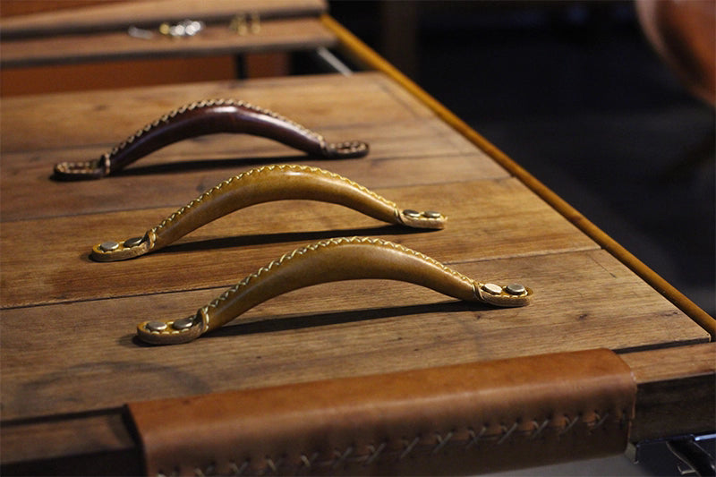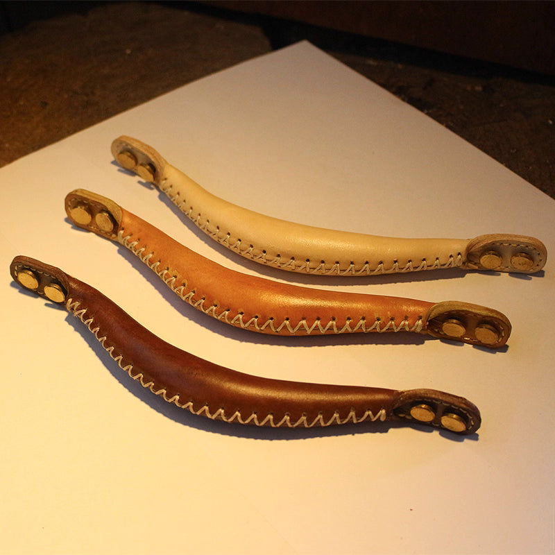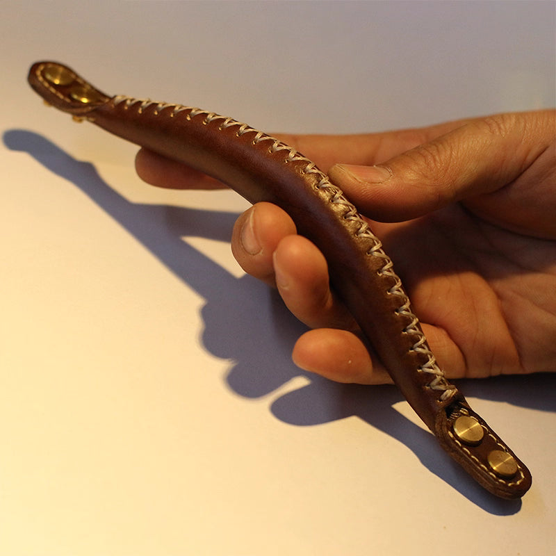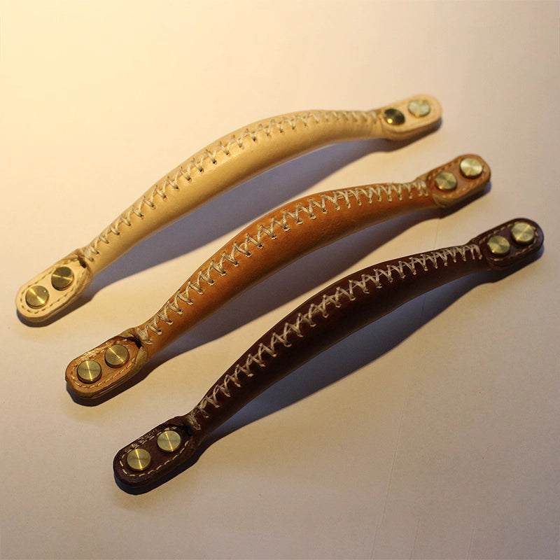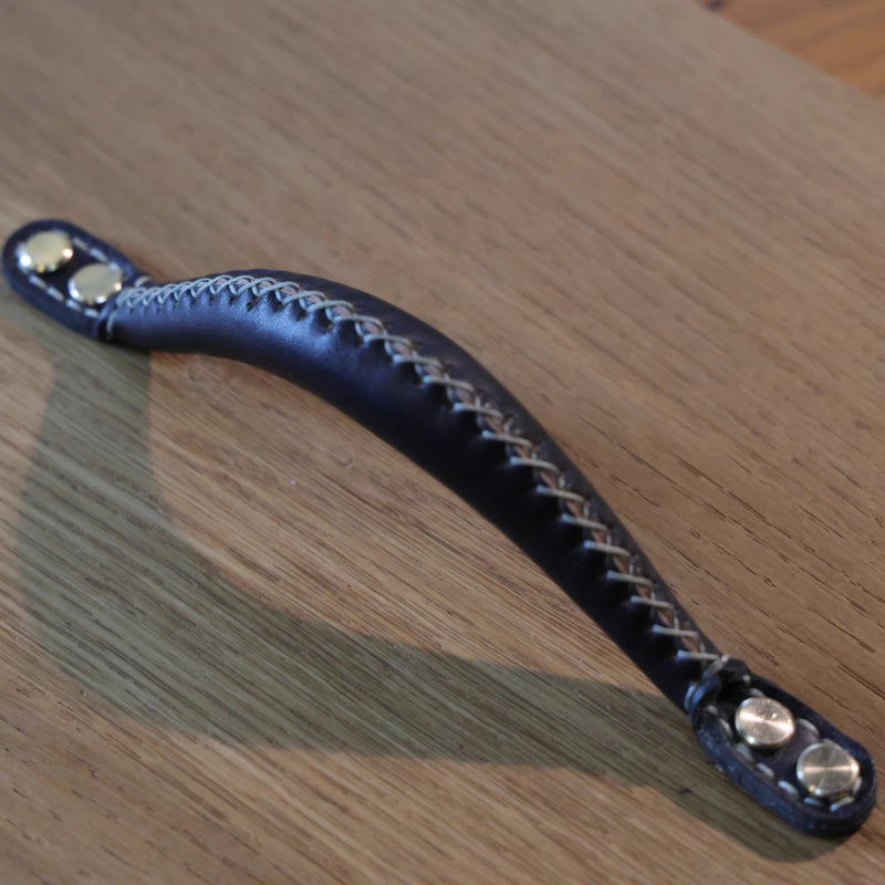 The Wentworth is a statement cabinet handle that combines the richness of hand-dyed leather with the enduring strength of solid brass. At 16cm in length, it is perfectly proportioned for wardrobes, larger cabinet doors, and feature furniture pieces, offering both durability and elegance in every detail.